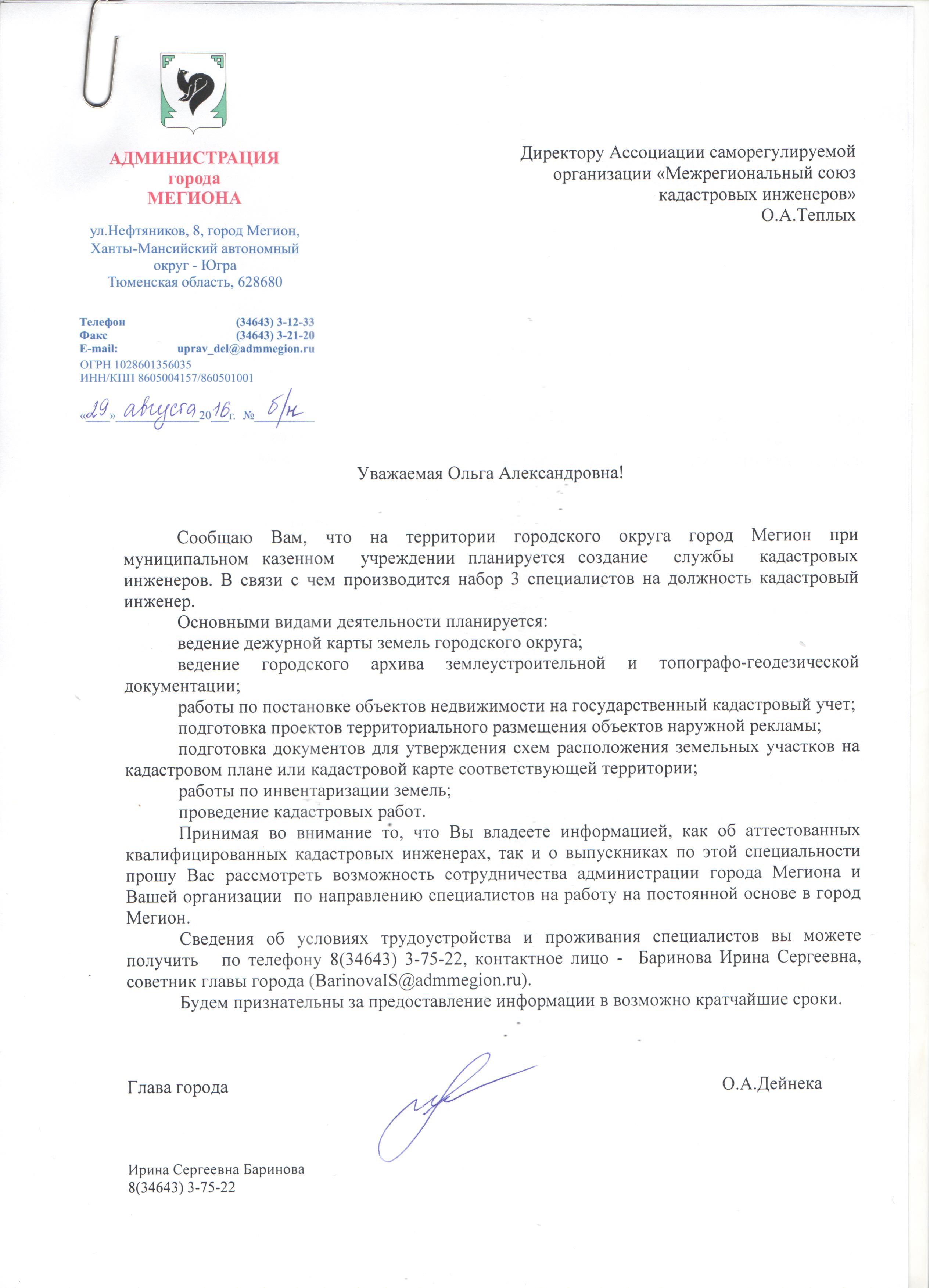 Письмо Администрации Города Мегион от 29.08.2016 г.