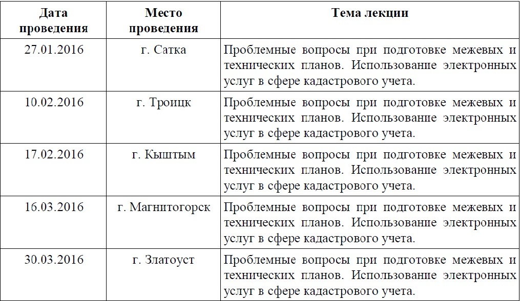 В первом квартале Кадастровой палатой по Челябинской области запланировано к проведению 5 лекций в следующих городах: Сатка (27 января), Троицк (10 февраля), Кыштым (17 февраля), Магнитогорск (16 марта), Златоуст (30 марта).