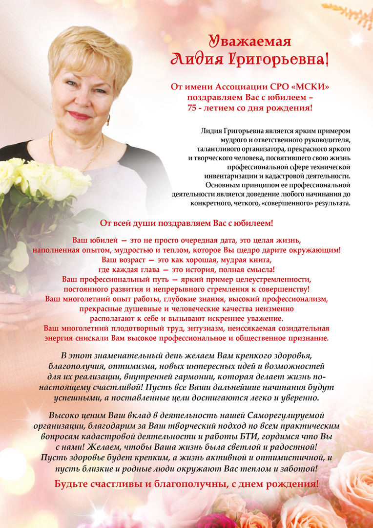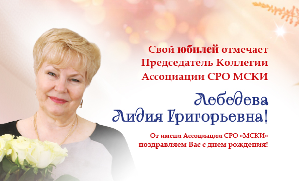 Сегодня свой юбилей отмечает Председатель Коллегии Ассоциации СРО МСКИ Лебедева Лидия Григорьевна!